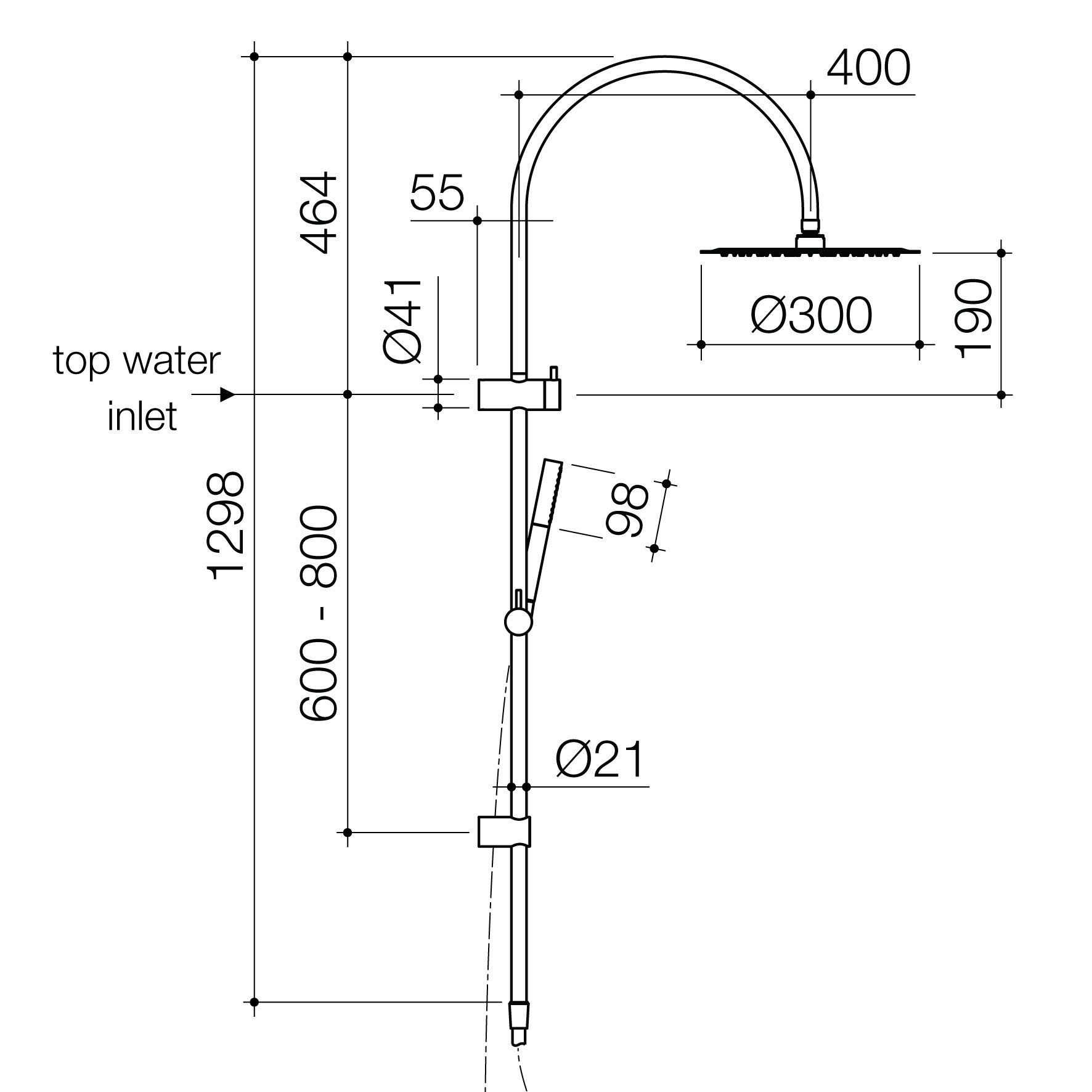 - Integrated diverter for seamless transition between hand and overhead shower